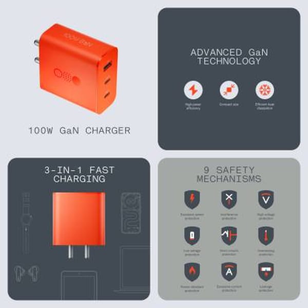 CMF by Nothing 100 W Power GaN 5 A 3 Port Mobile Charger with Detachable Cable Orange, Cable Included